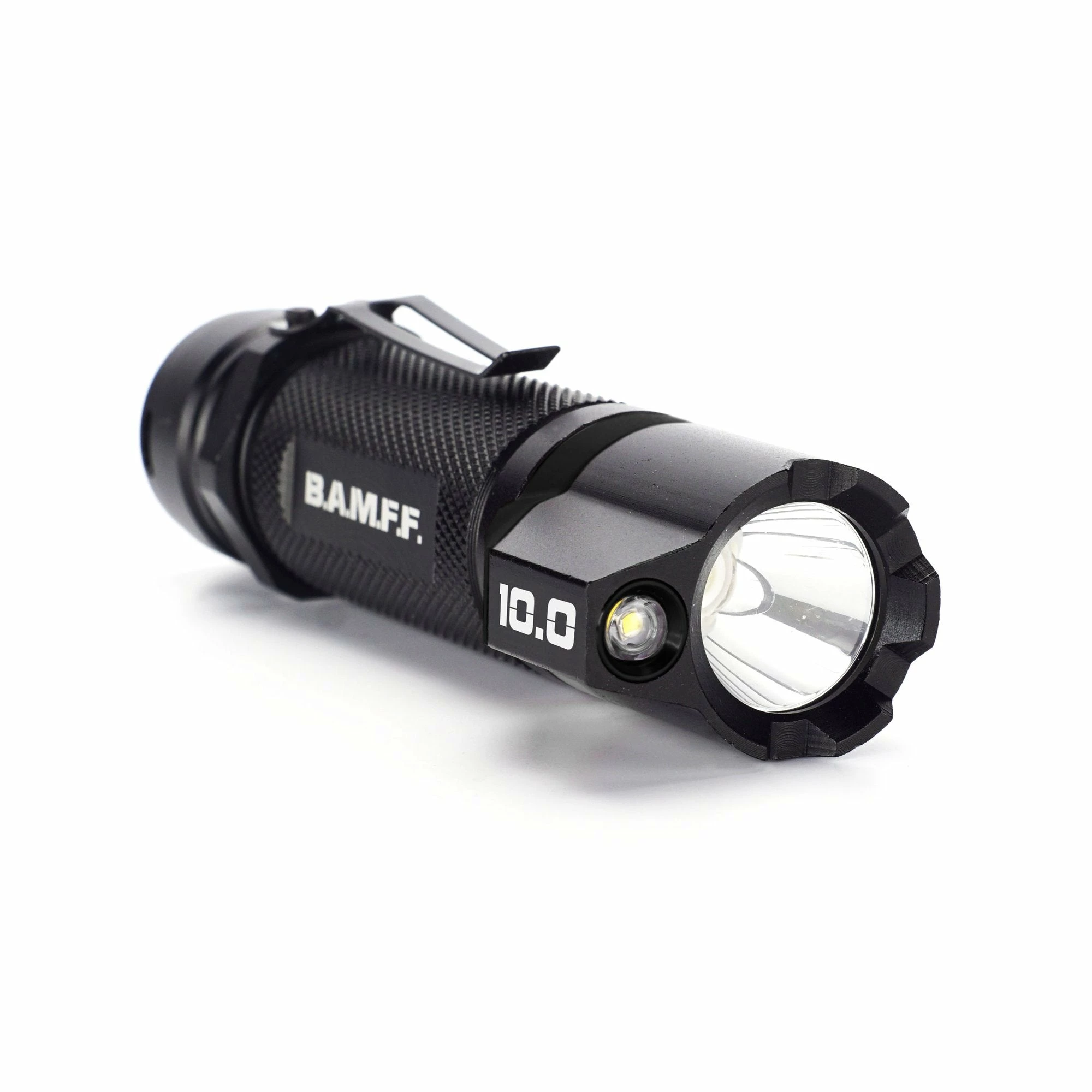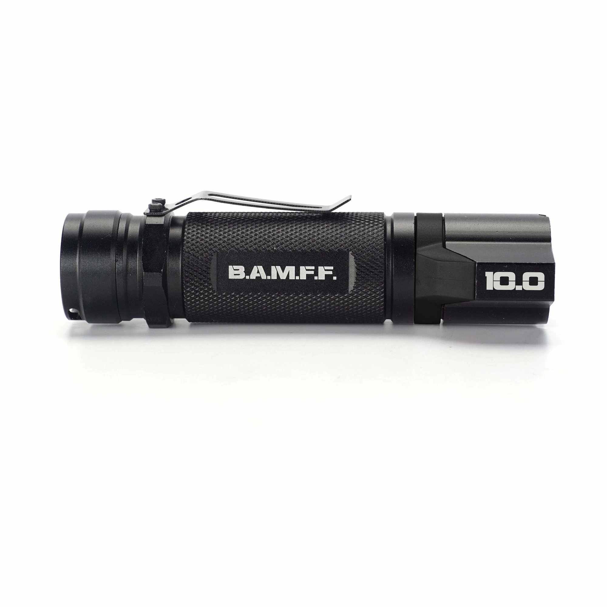 The BAMFF 10.0 features a Dual LED head, aircraft grade aluminum body, waterproof construction, removable belt clip, S.O.S. and disorienting strobe modes, and tactical style bludgeon tip for self-defense. The 10.0 comes with an 18650 rechargeable Lithium Ion battery (2600mAh) with a direct USB recharging port. Also, as a unique emergency feature, the BAMFF 10.0 comes with a “AAA” battery cartridge for those times when you can’t charge your rechargeable 18650 battery, thus ensuring you are never left in the dark. It also comes with a full gun mounting kit including a remote, 2-button pressure switch, and a picatinny gun mount. The BAMFF 10.0 emits a blinding 1,000 lumens, providing an optimum field of view for a wide array of activities including camping, hunting, hiking, police, military, repair, and daily carry.